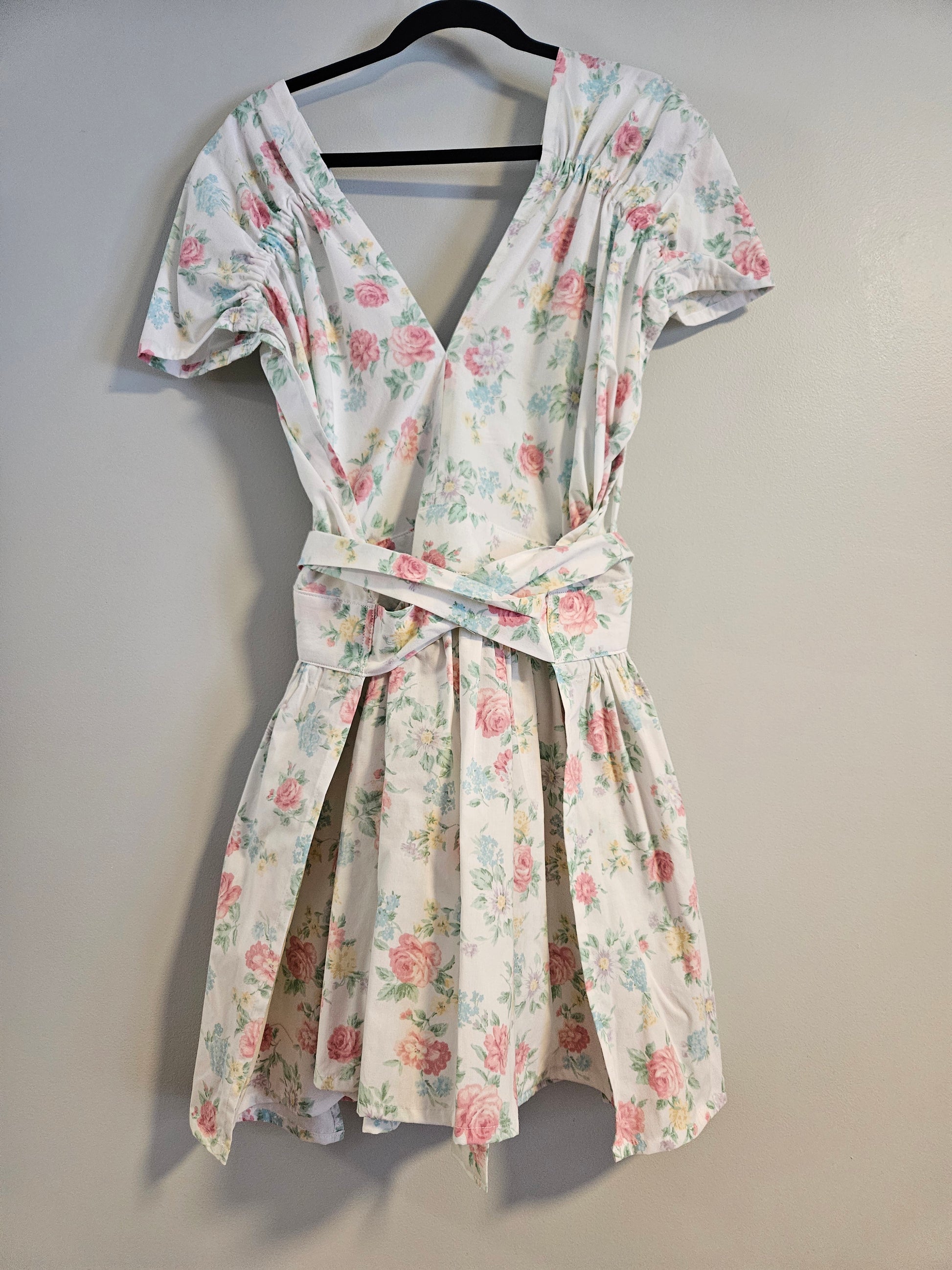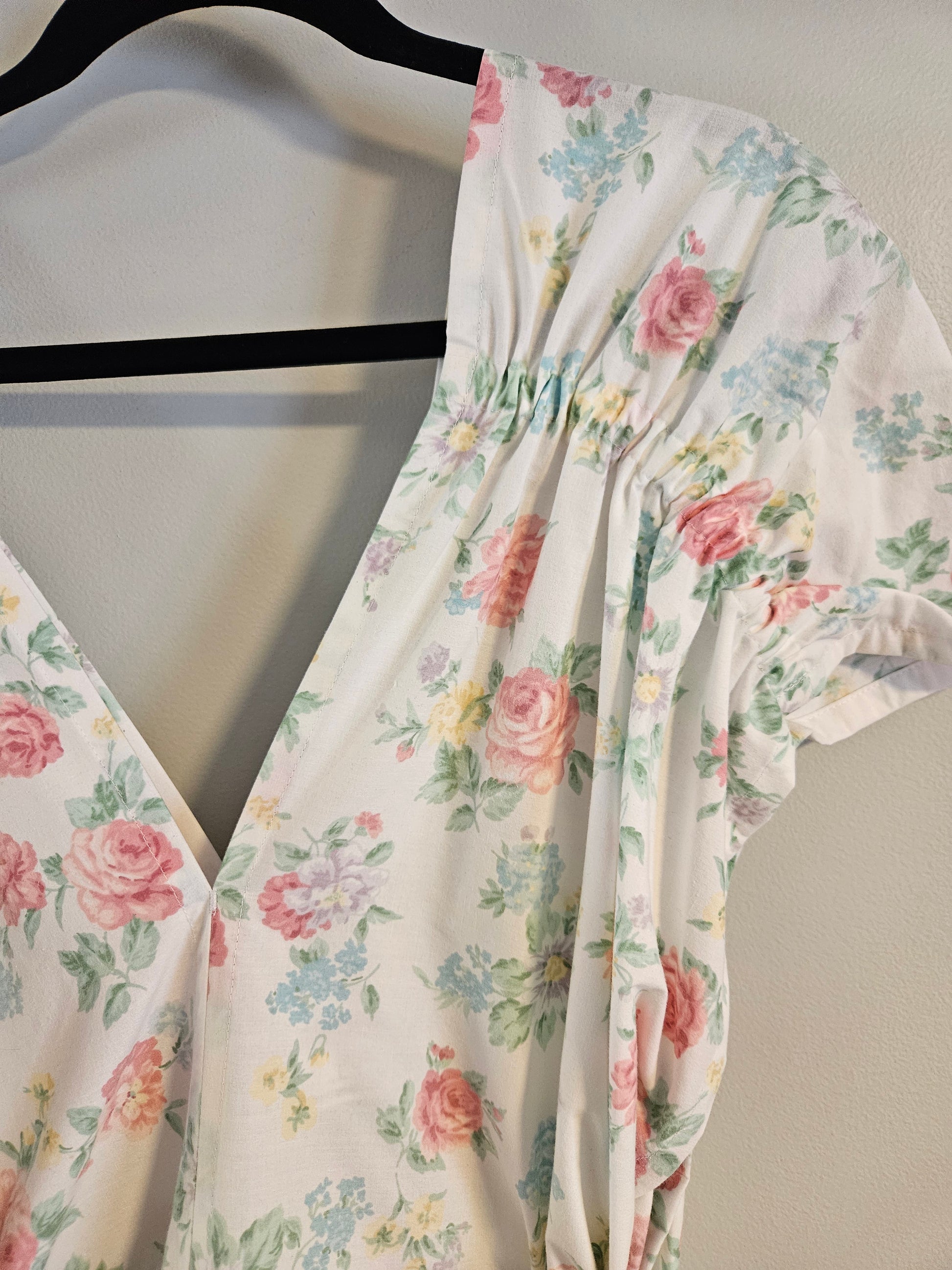 Pink roses and other colorful florals. Above the knee. Elastic cap sleeve. No pockets.