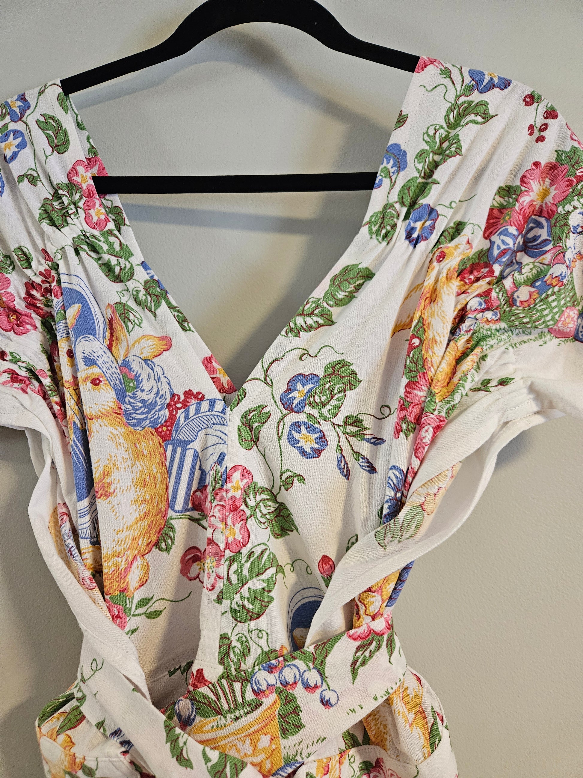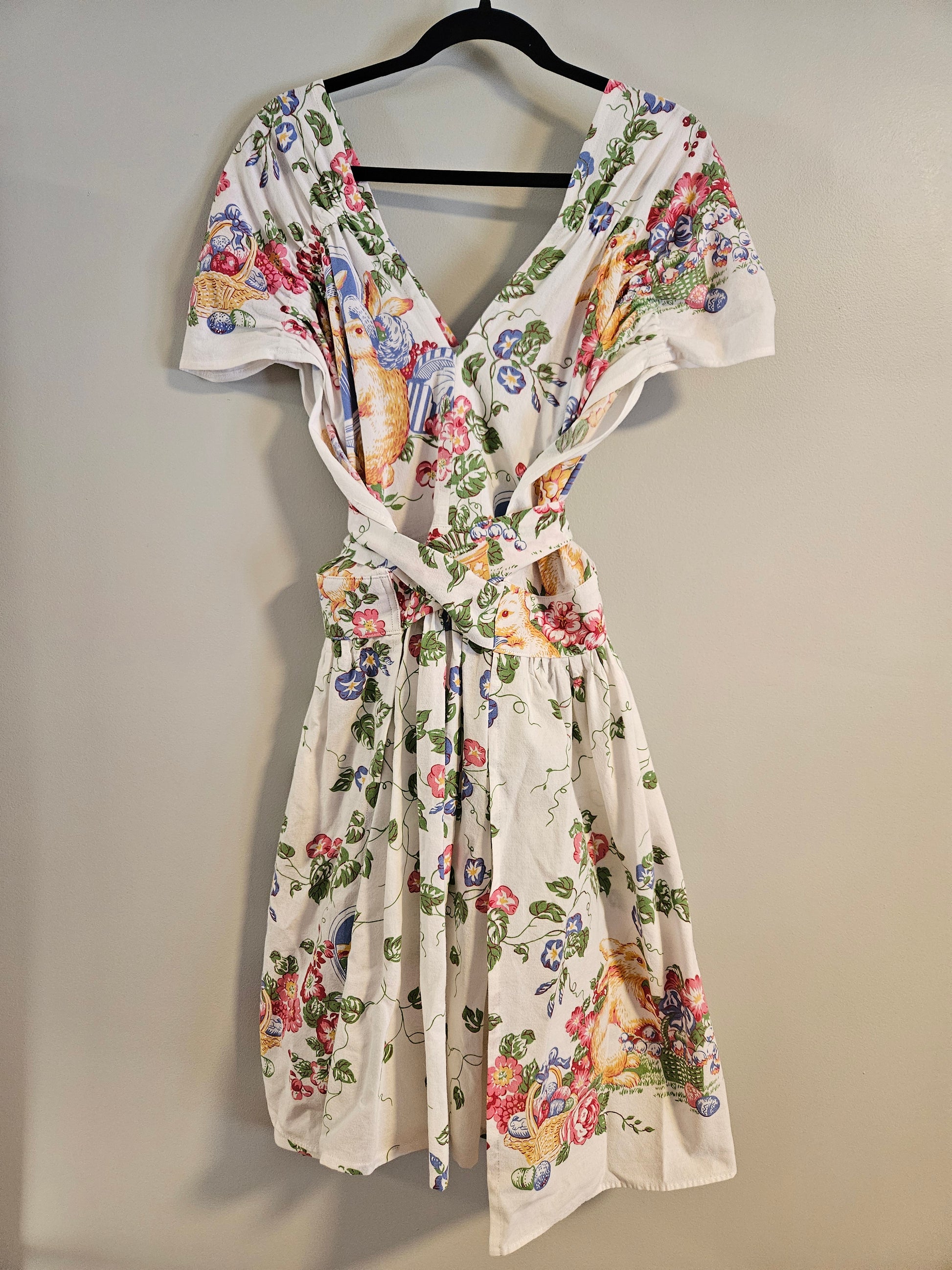 Lovely little dress made from an adorable tablecloth with floral vines and sweet little bunnies. Knee length. Elastic cap sleeve. No pockets.