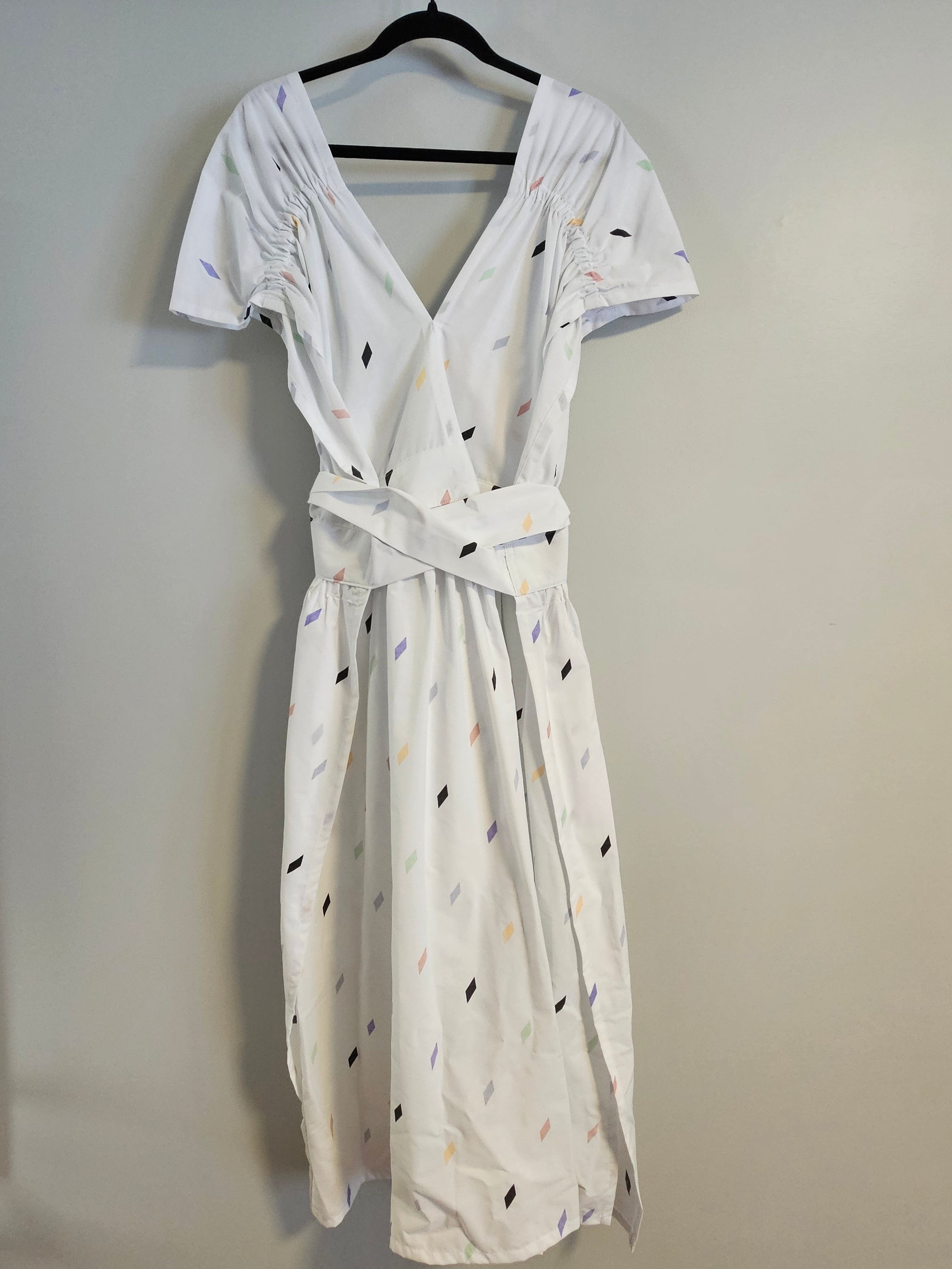 Pretty geometric confetti on white. Calf to ankle length. Elastic cap sleeve. No pockets.