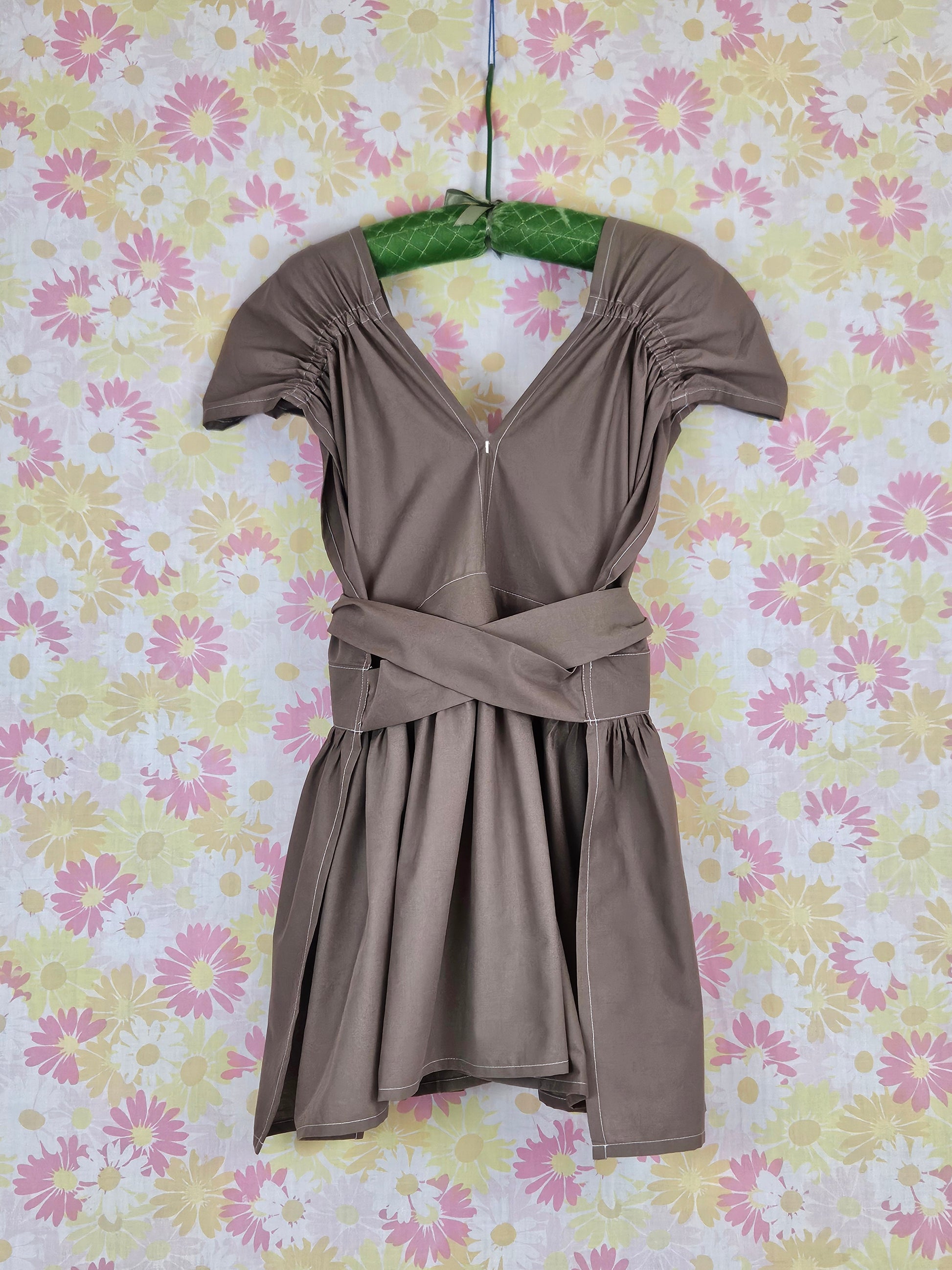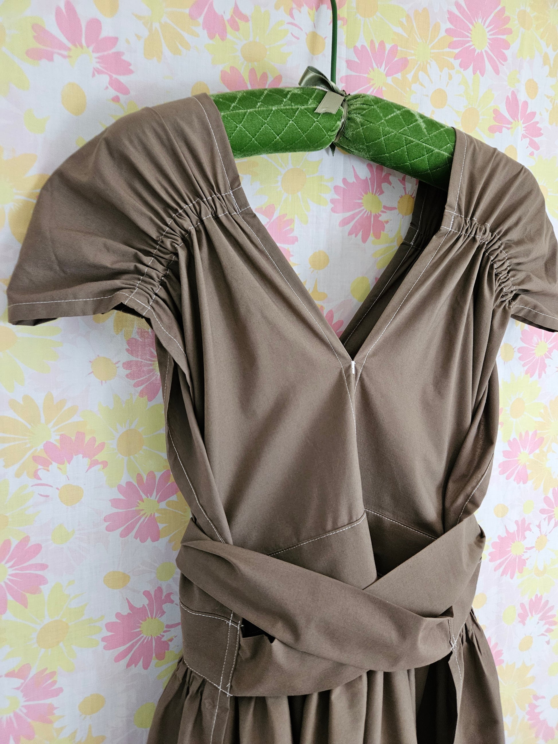 Pretty brown with a couple subtle variations in wear/color. Elastic cap sleeve. Just above knee length. No pockets.