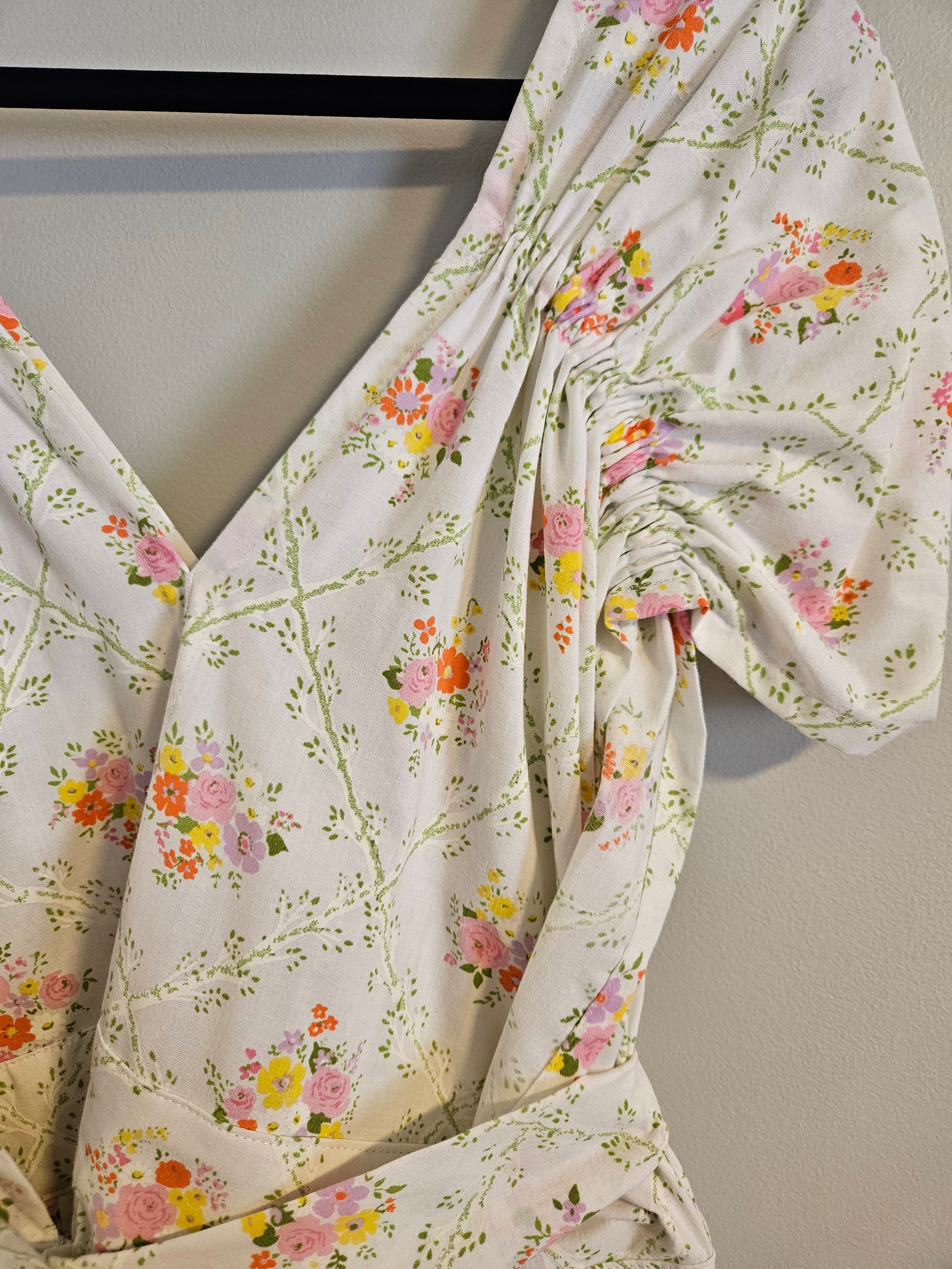 Cute florals in a grid pattern on off-white. Knee length. Cap sleeve with elastic. No pockets.
