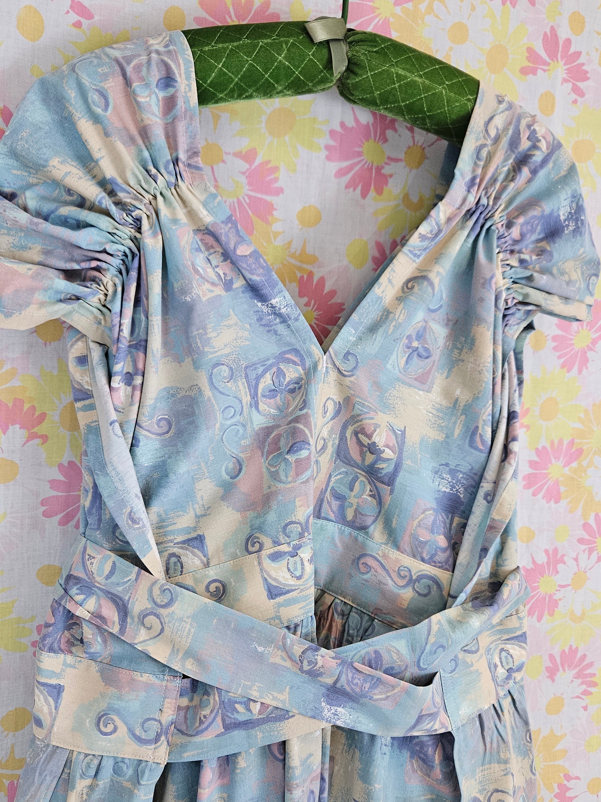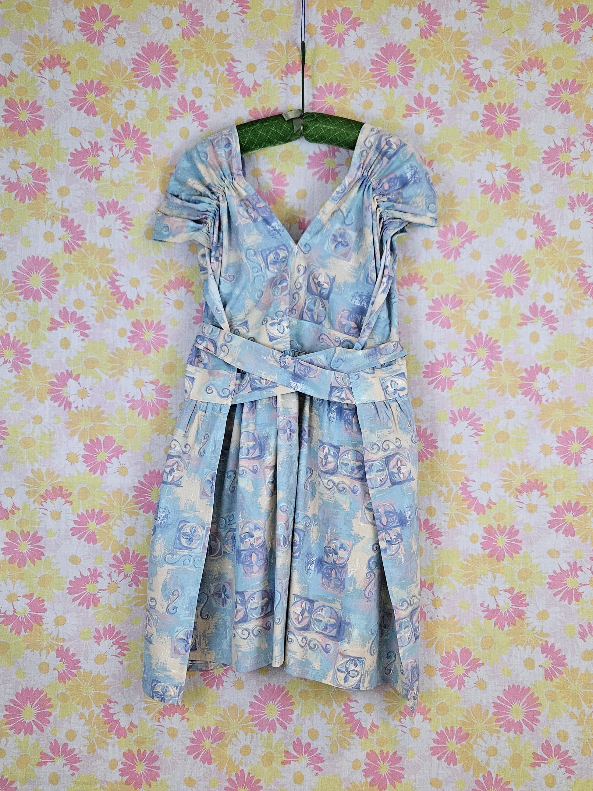 This print reminds me of Florida spring break in the early aughts. Lots of purple-y blues, beiges, and pinks. Cap sleeve with elastic. Knee length. No pockets.