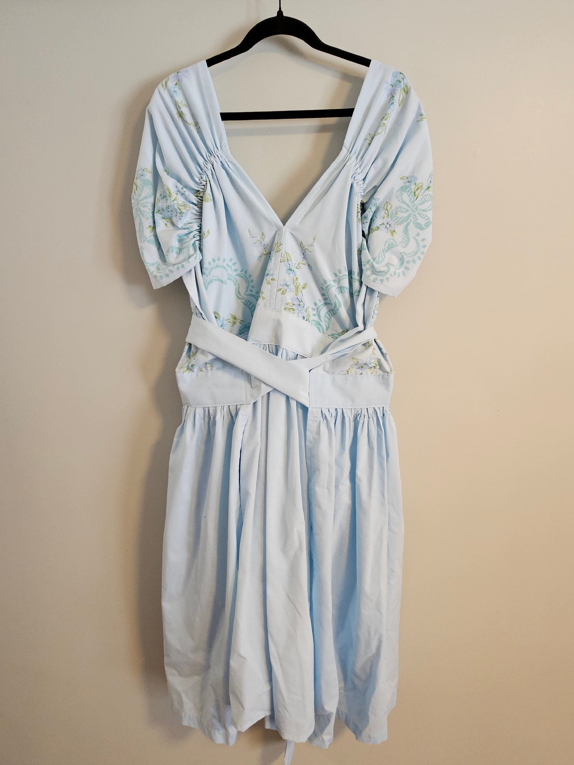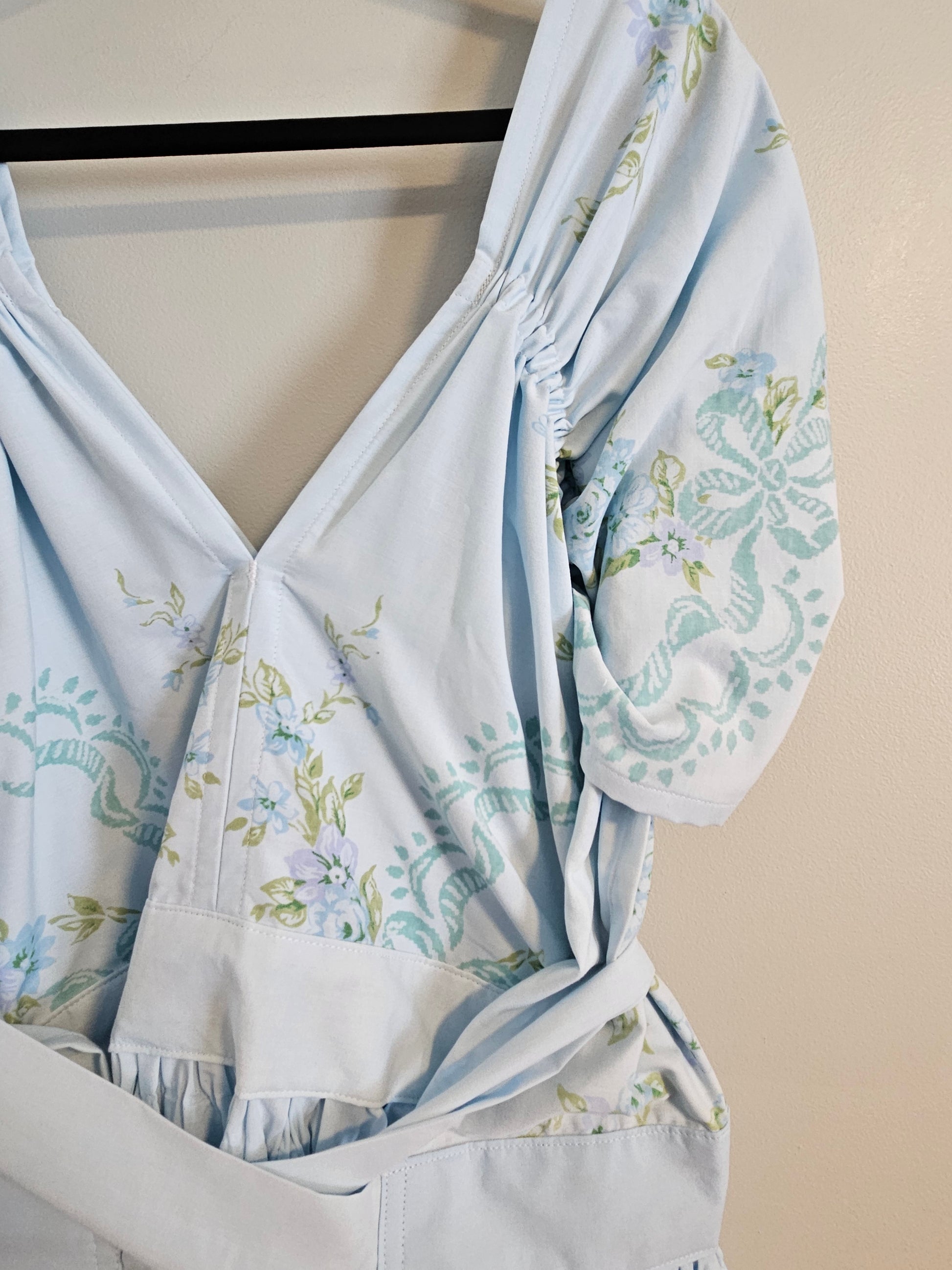 Lovely florals and bow print on light blue. Calf length. Cap sleeve with elastic. No pockets.